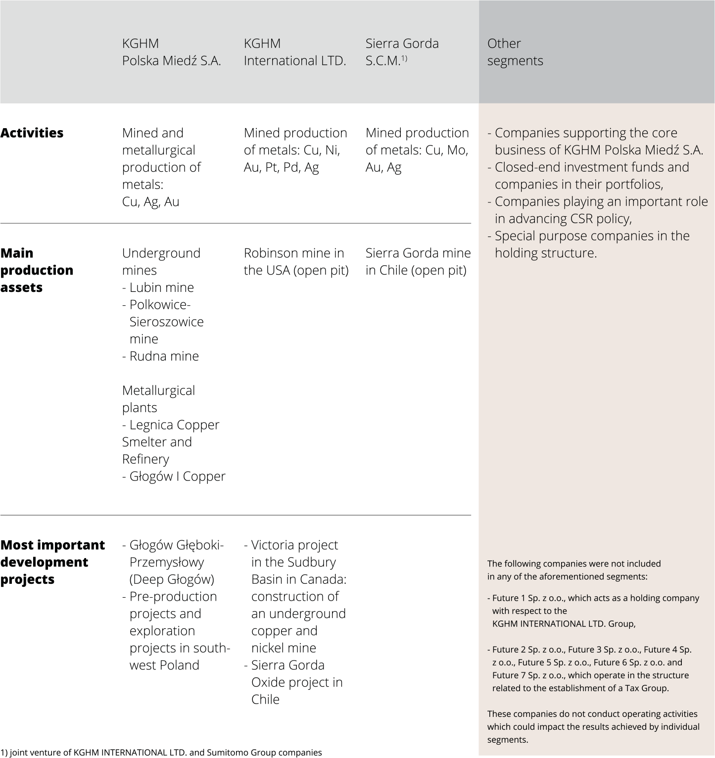 The Group’s main entities, which are engaged in the mining sector, comprise three primary reporting segments which are independently evaluated by management bodies. These are: KGHM Polska Miedź S.A., KGHM INTERNATIONAL LTD. and Sierra Gorda S.C.M. Other companies, excluding Future 1 Sp. z o.o., Future 2 Sp. z o.o., Future 3 Sp. z o.o., Future 4 Sp. z o.o., Future 5 Sp. z o.o., Future 6 Sp. z o.o. and Future 7 Sp. z o.o., are part of the segment called Other segments.