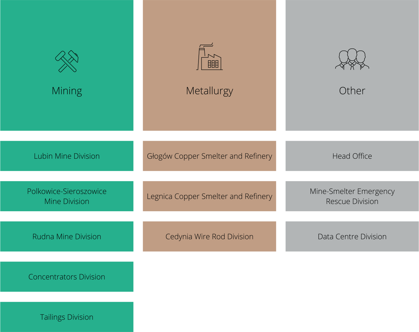 In 2019, the multi-divisional organisational structure of the Company, acting under the name KGHM Polska Miedź S.A., comprised the Head Office of the Company and 10 Divisions