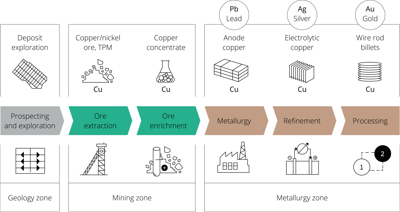 The core business of the KGHM INTERNATIONAL LTD. Group of companies is the mined production of metals, such as copper, nickel, gold, platinum and palladium, from both open-pit and underground mines, as well as advancement of mining and exploration projects. The drawing above shows a simplified flowchart of the core business of the KGHM INTERNATIONAL LTD. Group.