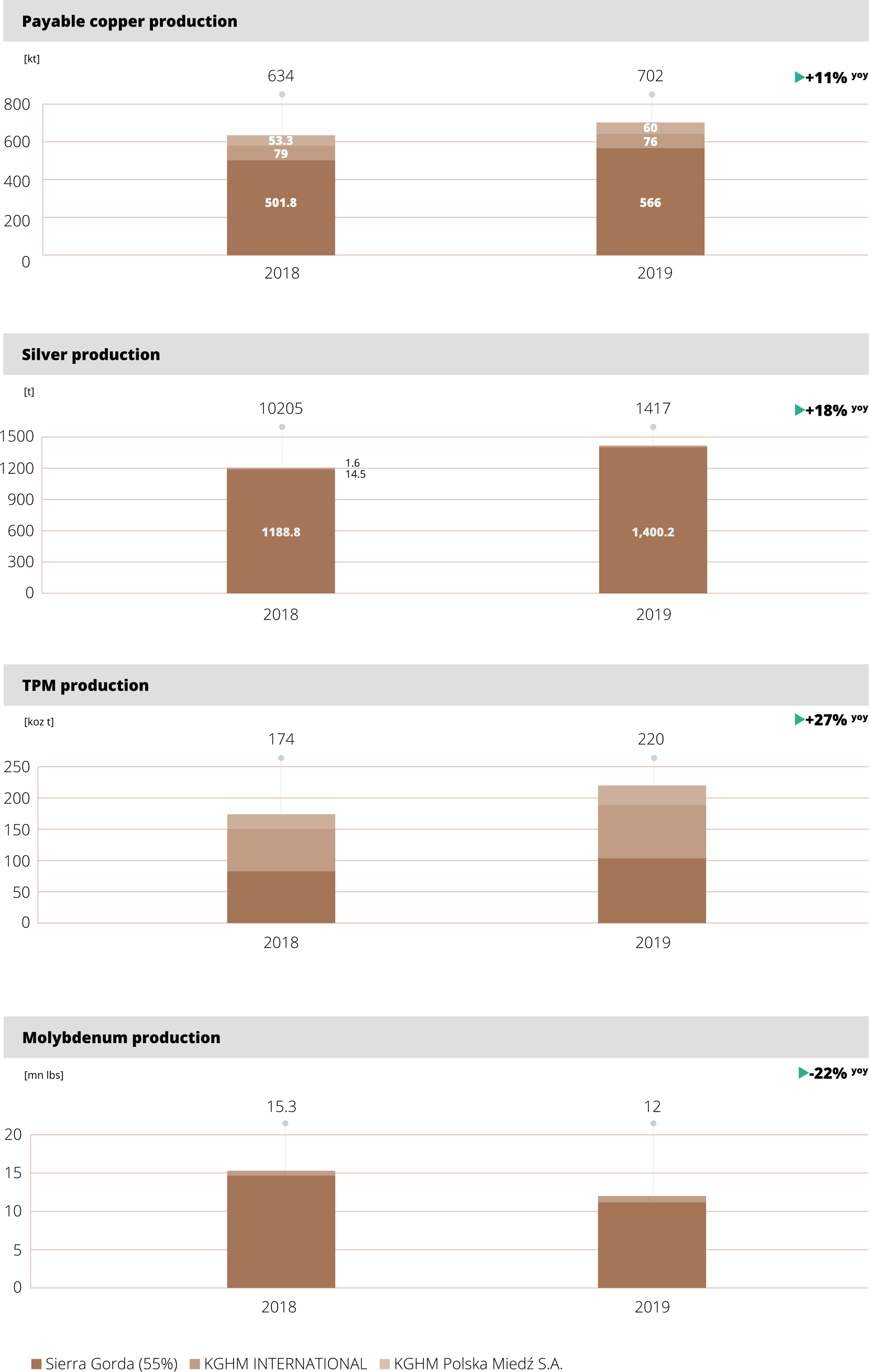 In 2019, the KGHM Group recorded an increase in payable copper production compared to 2018 by 11% to 702 thousand tonnes. The Group also achieved record high production of silver at 1,417 tonnes, up 18% from the production achieved in 2018 (1,205 tonnes).