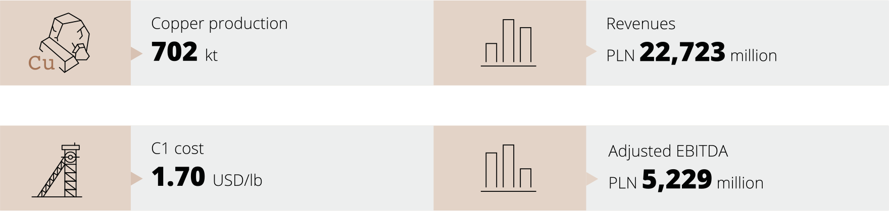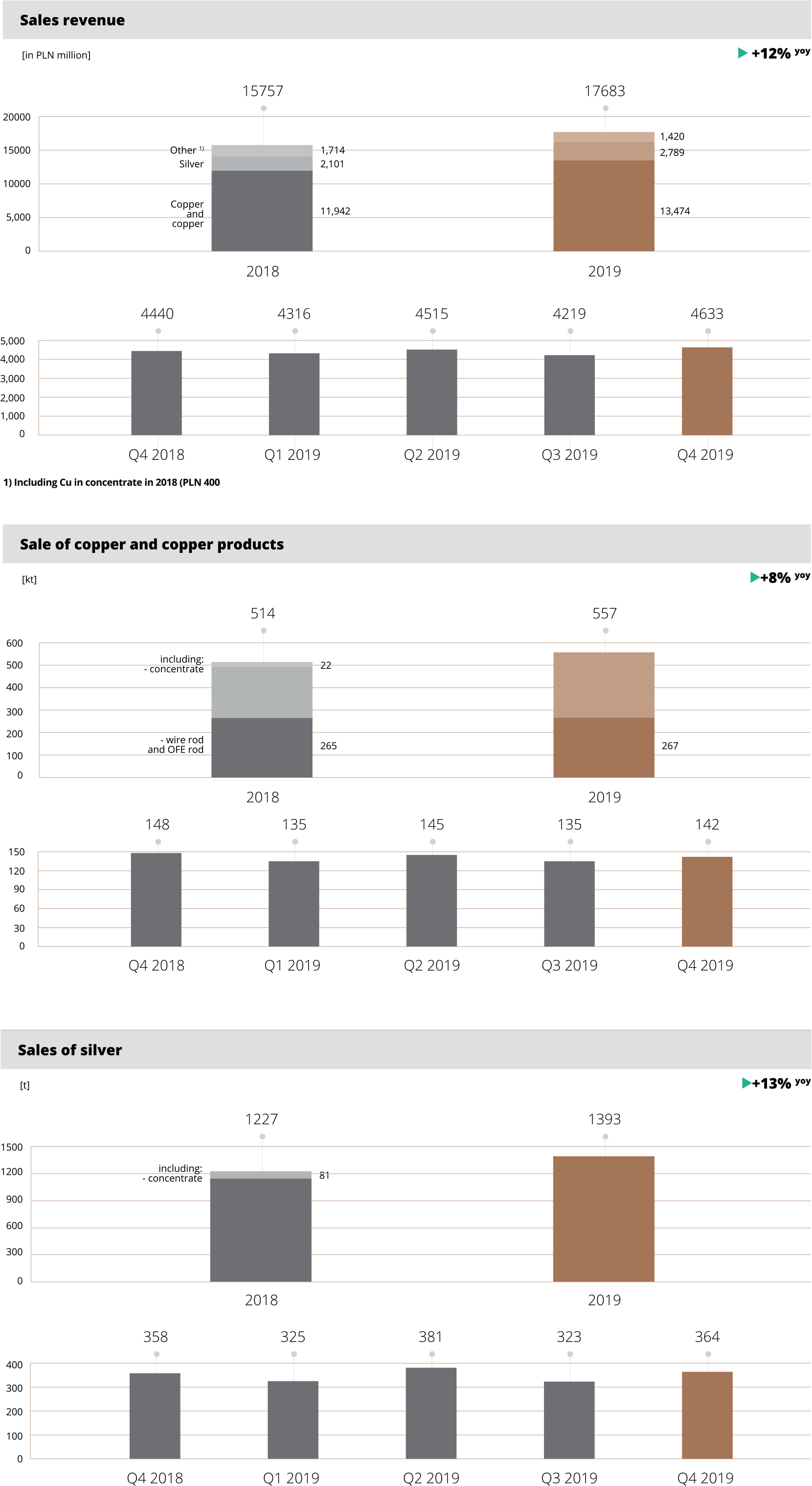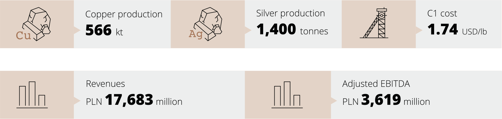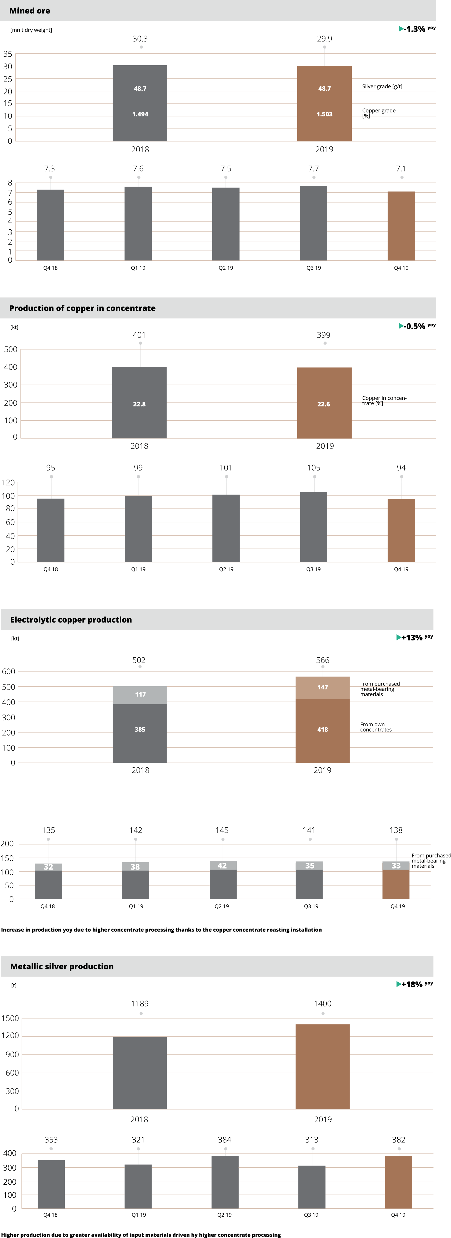 Average copper content in extracted ore amounted to 1.50% and was higher than the level achieved in 2018 due to mining in regions with a higher copper ore content. The content of silver in the ore extracted was at a similar level of 48.7 g/tonne.