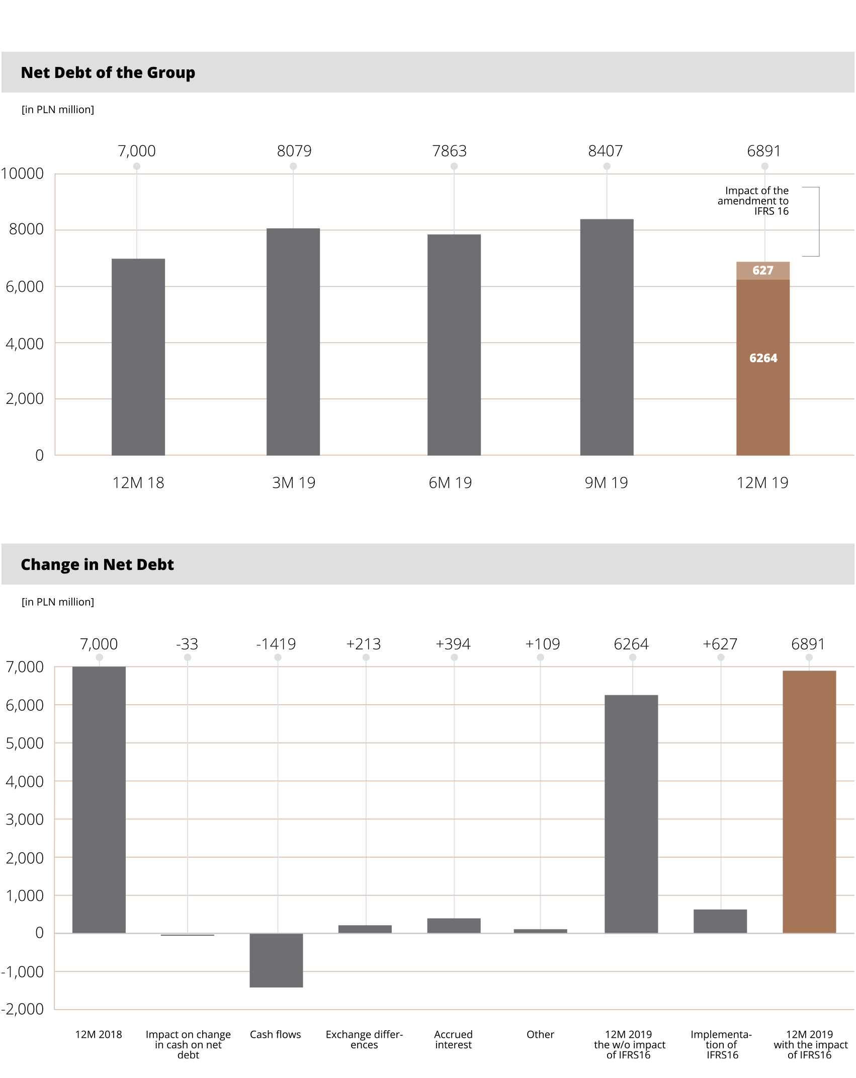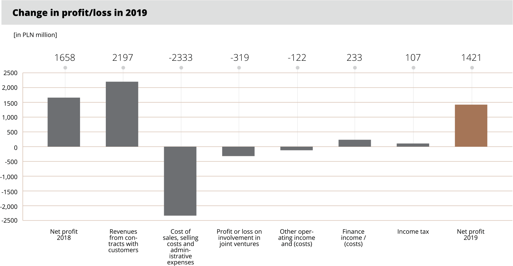 Revenues of the KGHM Group in 2019 were PLN 2,197 million higher (+11%) than in the same period of the previous year; the revenues of KGHM Polska Miedź S.A. increased by PLN 1,926 million. The increase was driven mainly by the increased volume of copper (+8%) and silver (+13%) sales, but also a more favourable exchange rate coupled with lower prices of copper. At the Group EBITDA level, contributions included higher operating results of KGHM Polska Miedź S.A. (+PLN 203 million, +6%), Sierra Gorda (+PLN 27 million, +4%) and other Group companies in Poland (PLN 40 million, +20%). The Group posted a consolidated net result of PLN 1,421 million.
