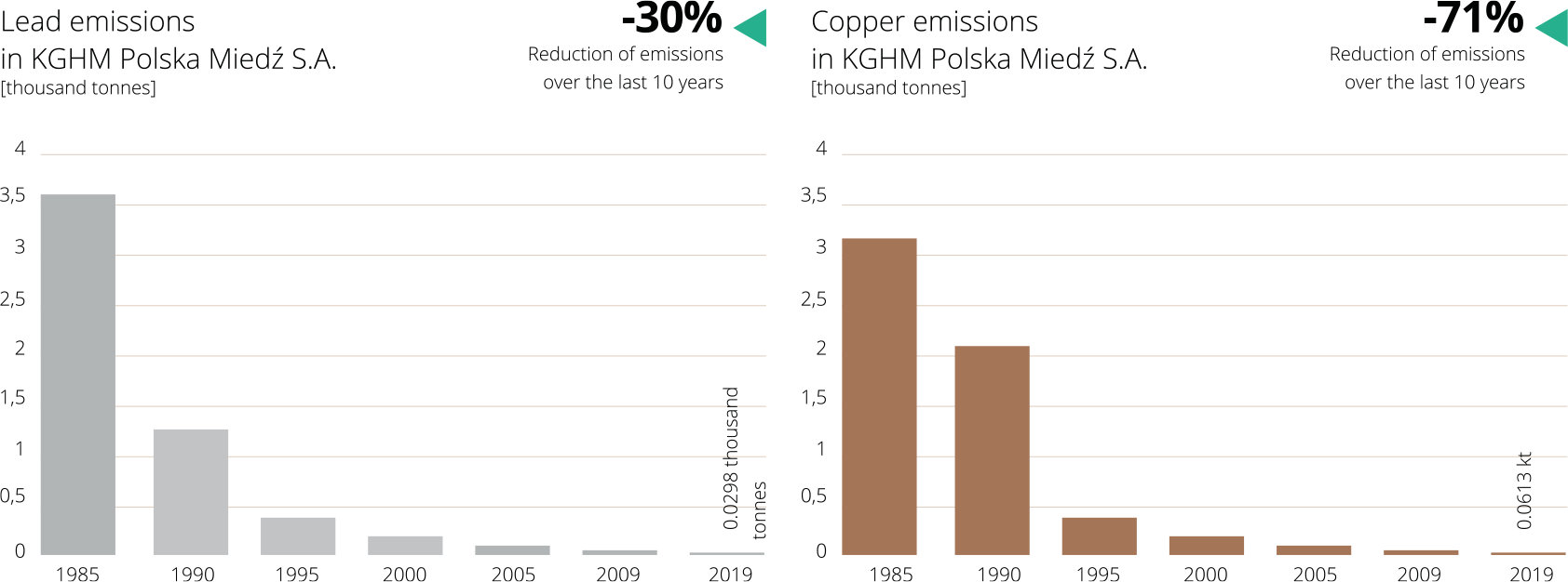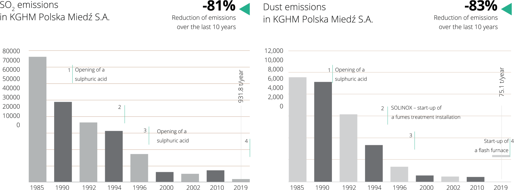 In 2019, the Company spent more than PLN 229 million on investments to protect the natural environment, of which the largest expenditure, in the amount of over PLN 44 million, was incurred on replacing the absorption and drying towers of the sulphuric acid plant at the Legnica Copper Smelter and Refinery.