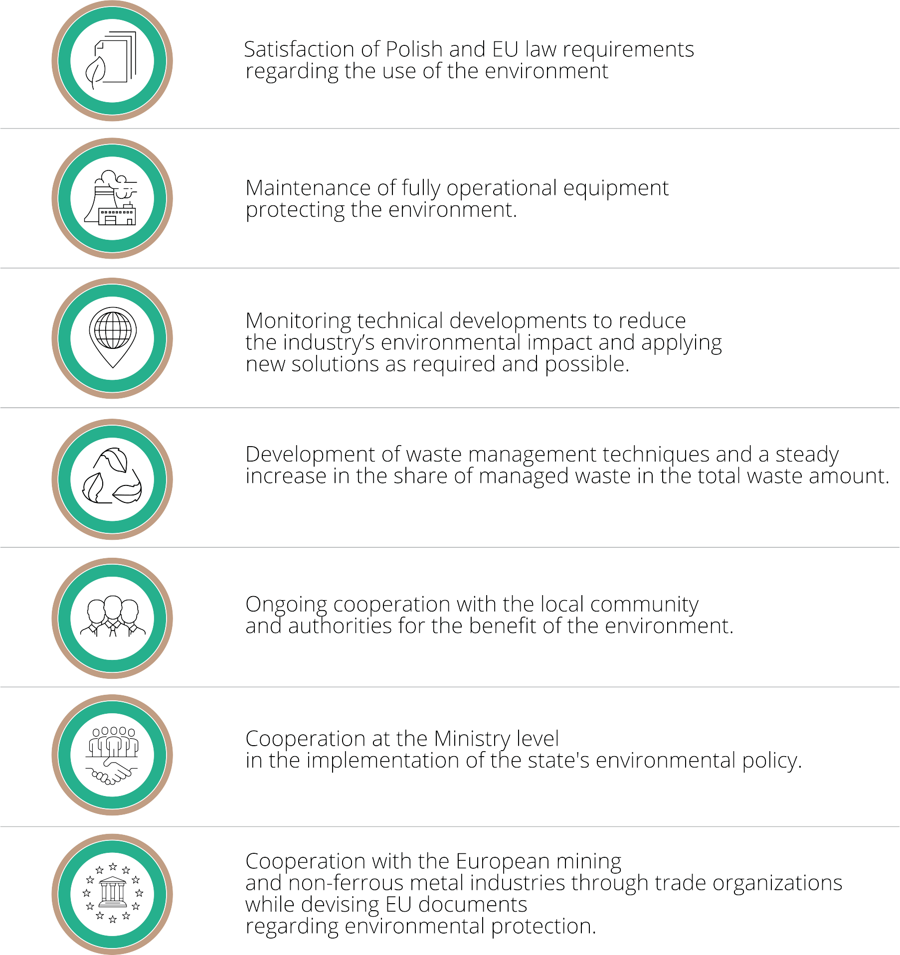 The aforementioned activities in three thematic groups related to natural environment protection and minimization of inconvenience related to operations are implemented in KGHM Polska Miedź S.A. thanks to the KGHM environmental policy and KGHM energy policy, which set the highest ecological and environmental standards for the Company.