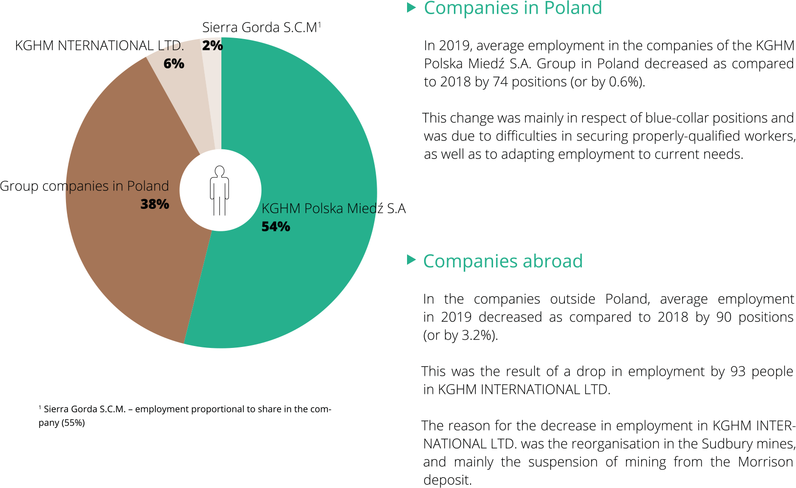 W 2019 r. przeciętne zatrudnienie w spółkach krajowych Grupy Kapitałowej KGHM Polska Miedź S.A. obniżyło się, w stosunku do roku 2018, o 74 etaty (tj. 0,6%). Zmiana dotyczy głównie stanowisk robotniczych i spowodowana jest trudnościami w pozyskaniu na rynku pracowników o odpowiednich kwalifikacjach, a także dostosowaniem zatrudnienia do bieżących potrzeb.