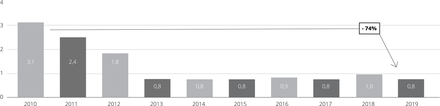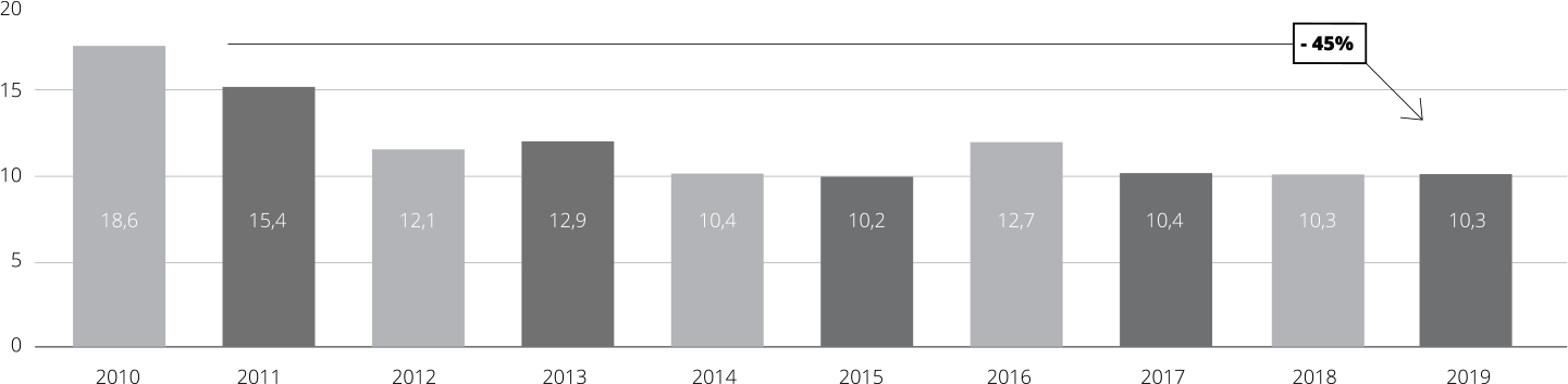 The LTIFRKGHM ratio (Lost Time Injury Frequency Rate KGHM) in 2019, or the total number of workplace accidents (as defined by the Act dated 30 October 2002 on social insurance due to workplace accidents and occupational illnesses) in the Company, being the number of accidents per million hours worked for the entire core business of KGHM Polska Miedź S.A., was at the same level as that achieved in 2018 – 10.30 – and at the same time was lower by 45% than the amount recorded in 2010:
