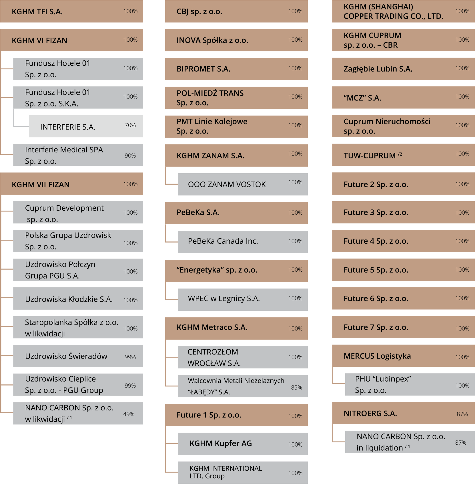The detailed structure of the KGHM Polska Miedź S.A. Group, along with interconnections between its members, is depicted in the two following diagrams.